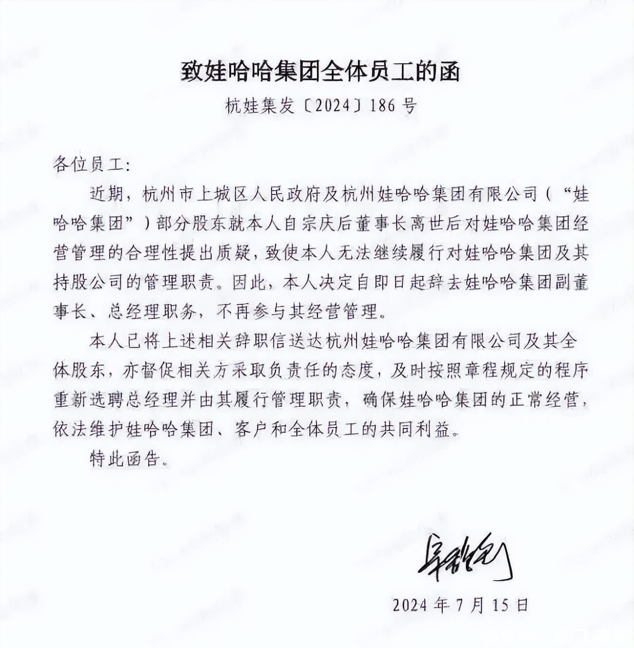 之前 10 月 10 号的时候,好几个权威媒体都报道了,说宗馥莉 9 月 12 号就给娃哈哈递了辞职报告,过了快一个月,公司董事会和股东会才批下来。不过大家也别误会,她虽然不在公司任职了,但还拿着 29.4% 的股份,依旧是娃哈哈的第二大股东。其实早在 2024 年,宗馥莉就辞过一次职,当时网上吵得沸沸扬扬,不少网友都替她觉得委屈,尤其是她亲叔叔宗泽后还落井下石,说她辞职是好事,吐槽她搞改革太莽撞,不考虑股东利益,这操作当时真让人没想到。